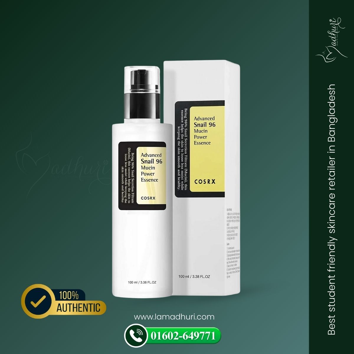 Hydrating essence with 96% snail secretion filtrate to repair skin barrier, reduce acne scars, and boost hydration. Suitable for all skin types.